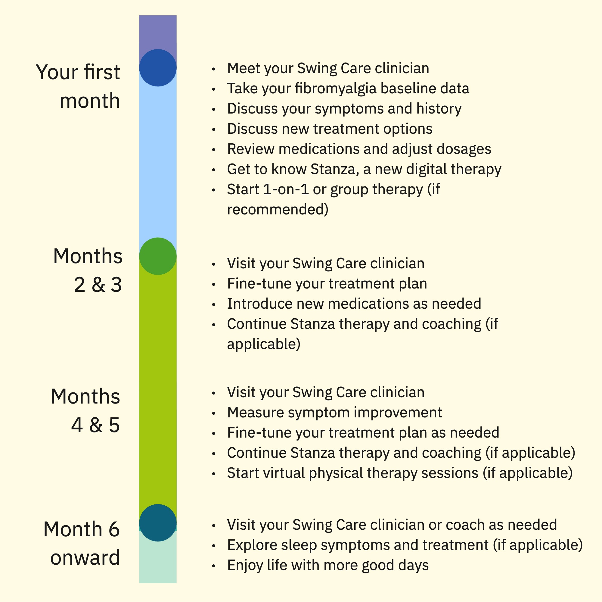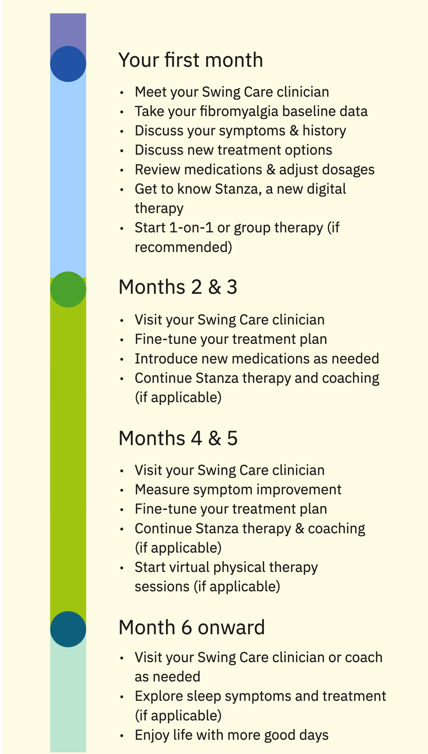The mission of Swing Care is to provide ongoing management for patients with fibromyalgia. You may continue your care with Swing Care for as long as you need our services, as determined by you and your Swing Care clinician.